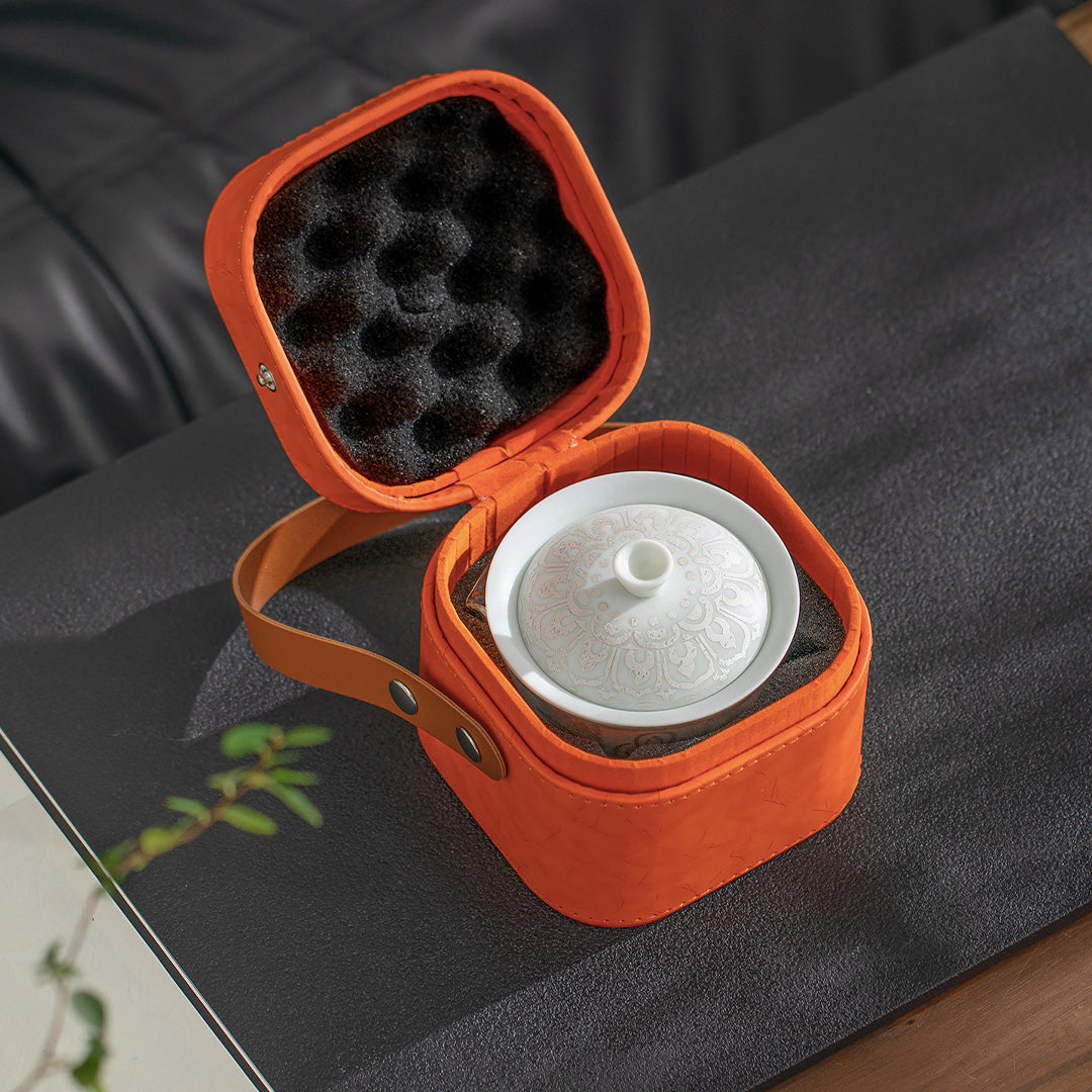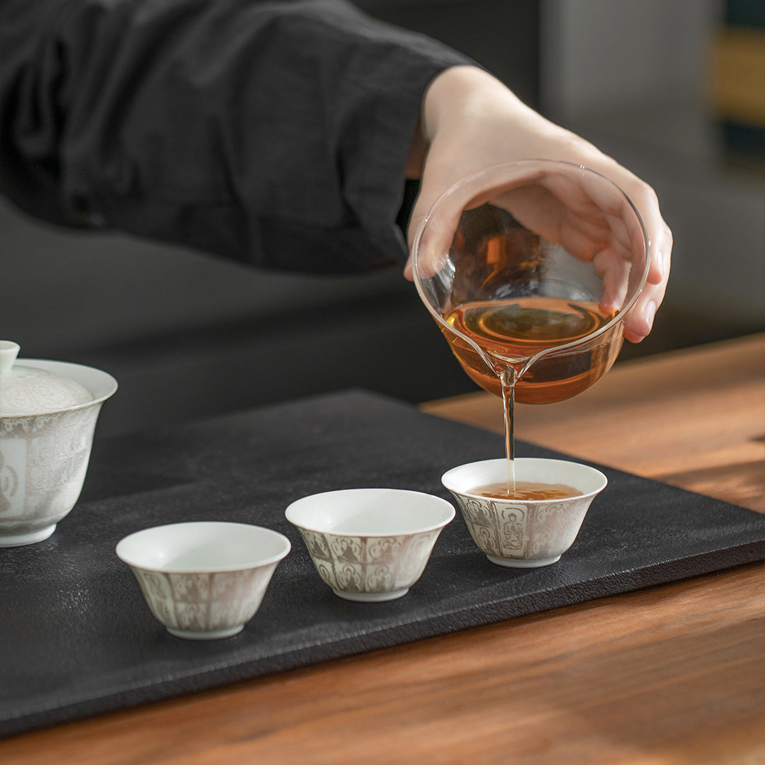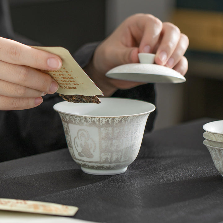 The Thousand Buddhas travel Gaiwan tea set is a blend of serene craftsmanship and spiritual elegance. Finished with a luminous silver glaze, this set reflects the infinite nature of peace—both in the quiet moments of tea and in the journey of the soul.