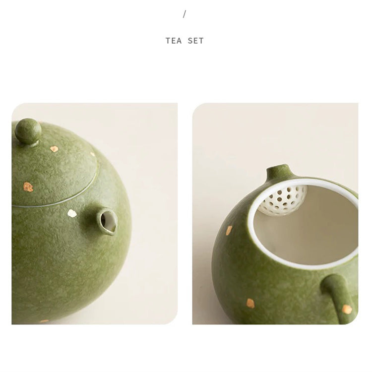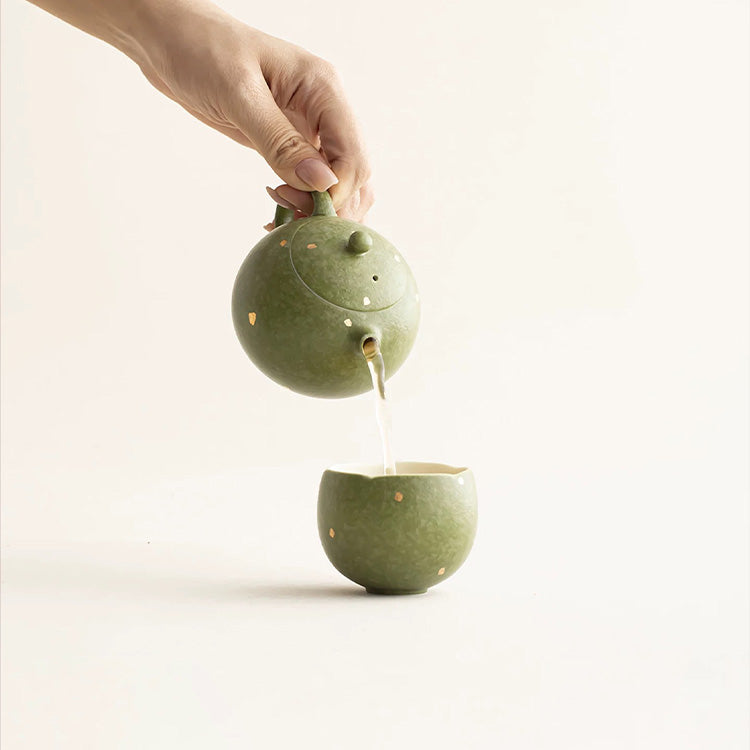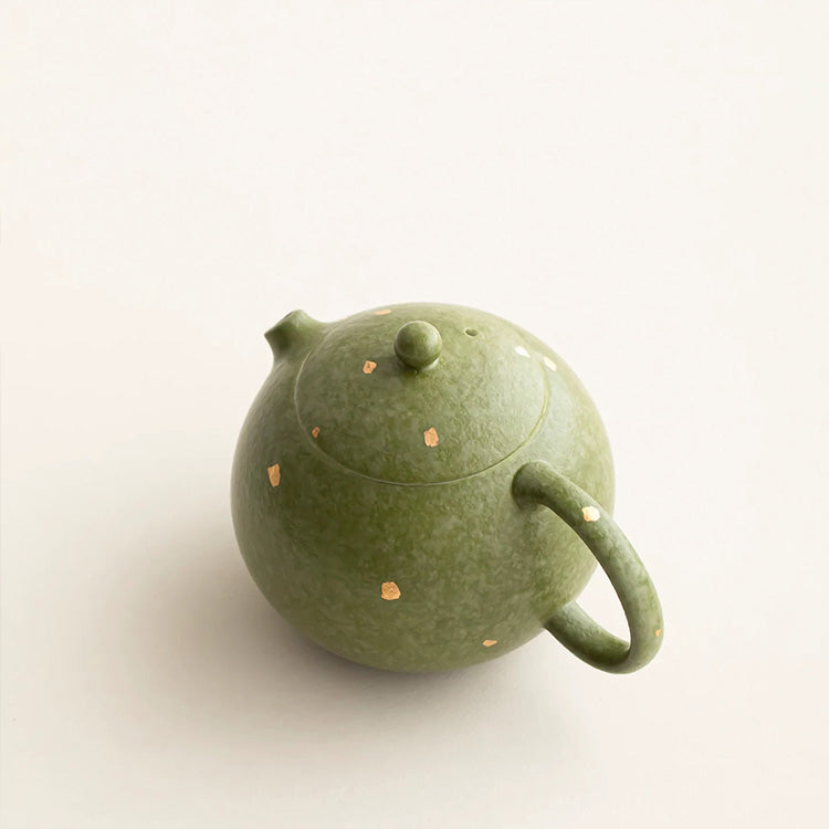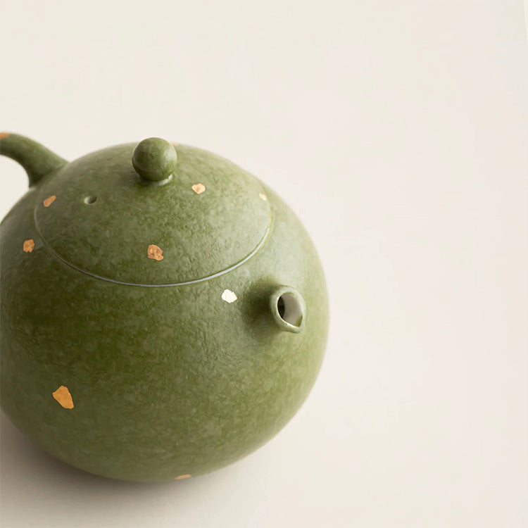 Green ceramic teapot with speckled pattern on a light beige background